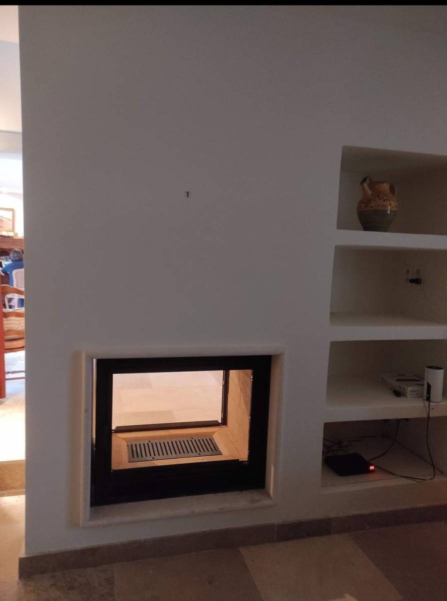 Parfait pour donner de la dimension à notre pièce de vie et marquer la séparation, cette cheminée à bois, avec foyer et niche de coté permet de sublimer votre espace.